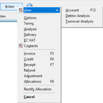Most processing forms provide an Action command button. Clicking this button or using the right-click menu on a List tab displays a menu of commands that control the further processing with a selected record.