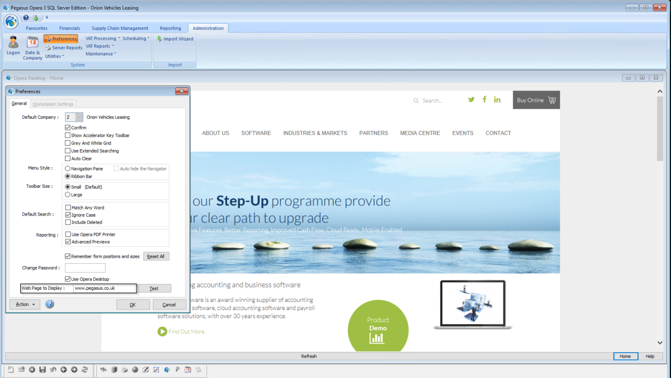 The home page is automatically set to the Pegasus Software website when Opera 3 SQL SE is installed. This can be changed by using the Web page to display setting on the Preferences form in the System Manager.